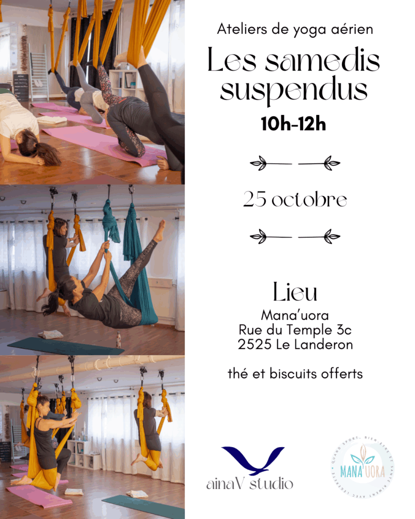 Les samedis suspendus sont des ateliers tous niveaux de yoga aérien.