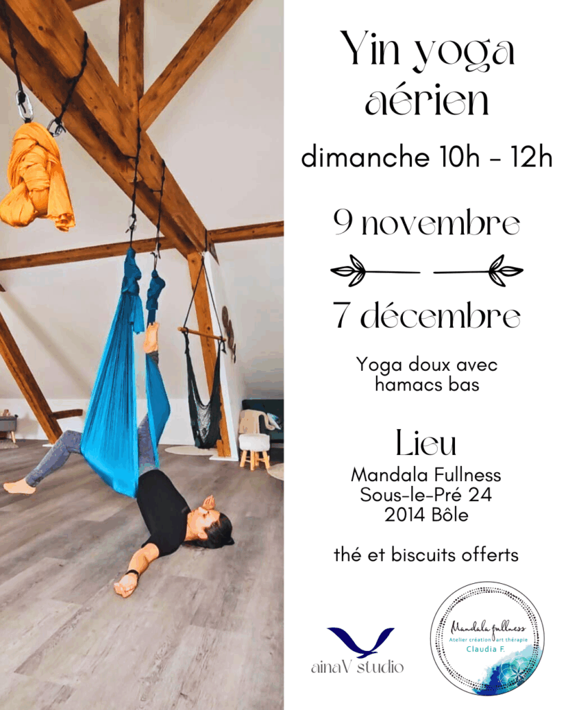 Vérifie avec ton médecin que tu n’as pas de contre-indications pour pratiquer le Yin yoga aérien. Chacun et chacune est responsable de sa pratique et de respecter ses limitations.